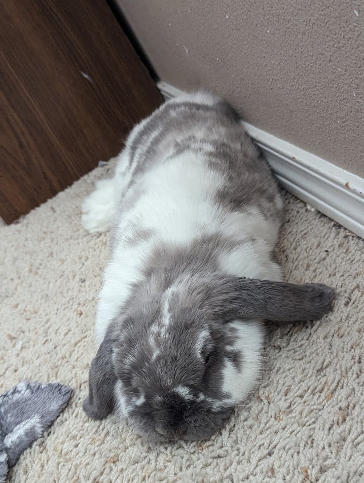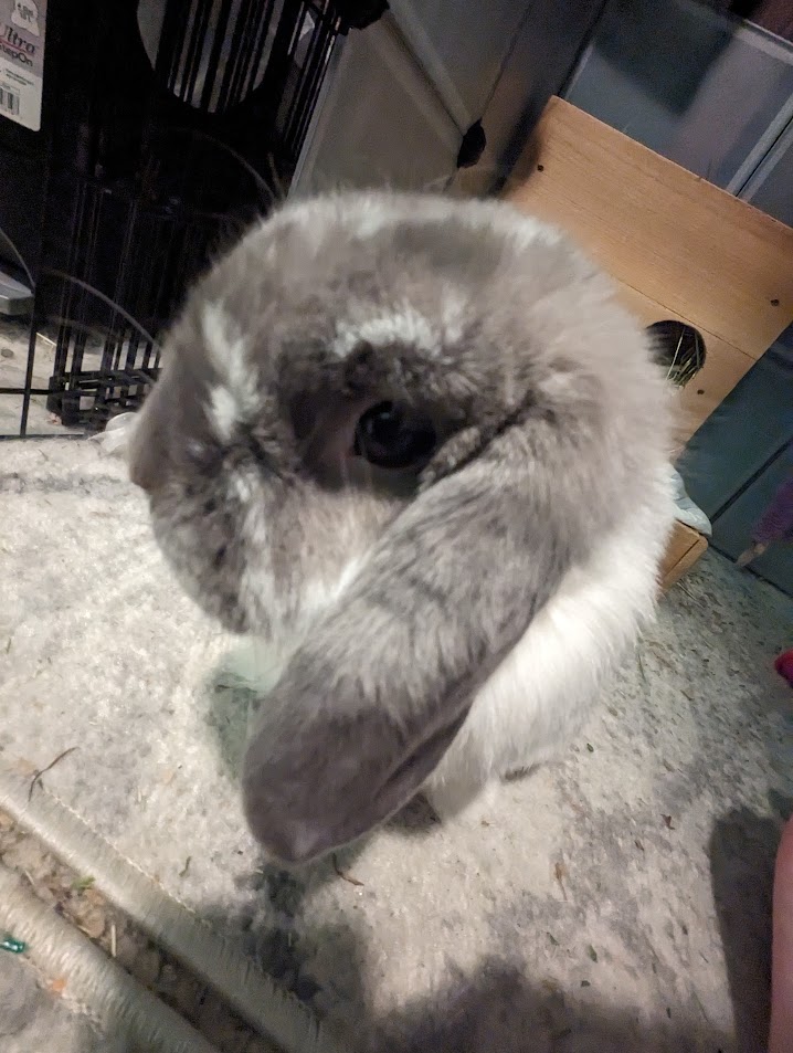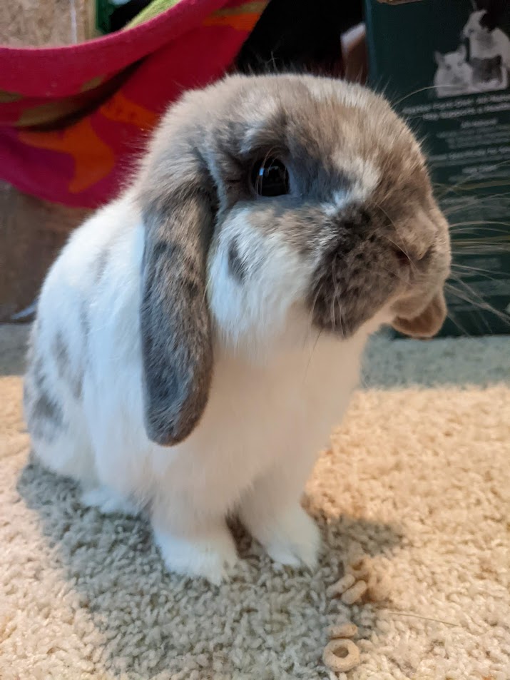 Henry is a 4.5 year old male Holland Lop with grey and white spots. His favorite hobby is to take naps under desks and tables. He loves eating cheerios and dried fruit, to the point that he will steal them from his friend, Hazel. He isn’t the biggest fan of being carried or cuddling, but he is always ready to accept head scratches.